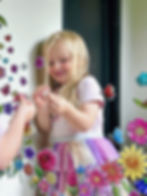 "Barna på helsestasjonen stopper opp foran *speiltegningene hvor de peker, snakker og utforsker speilbildet med fargerike tegninger rundt"